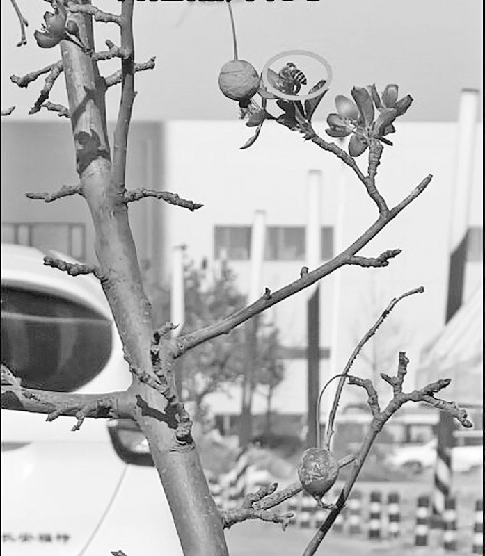 海棠树冬天开花引蜜蜂采蜜