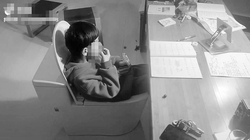 台灯下、书桌前,一个新买的马桶充当着座椅的角色,一个七八岁的小男孩并没朝着家长期待的样子专注于桌前的练习册,他在马桶上悠哉地坐着,不紧不慢地将一粒粒蓝莓送进嘴……这是孙先生镜头里的画面。