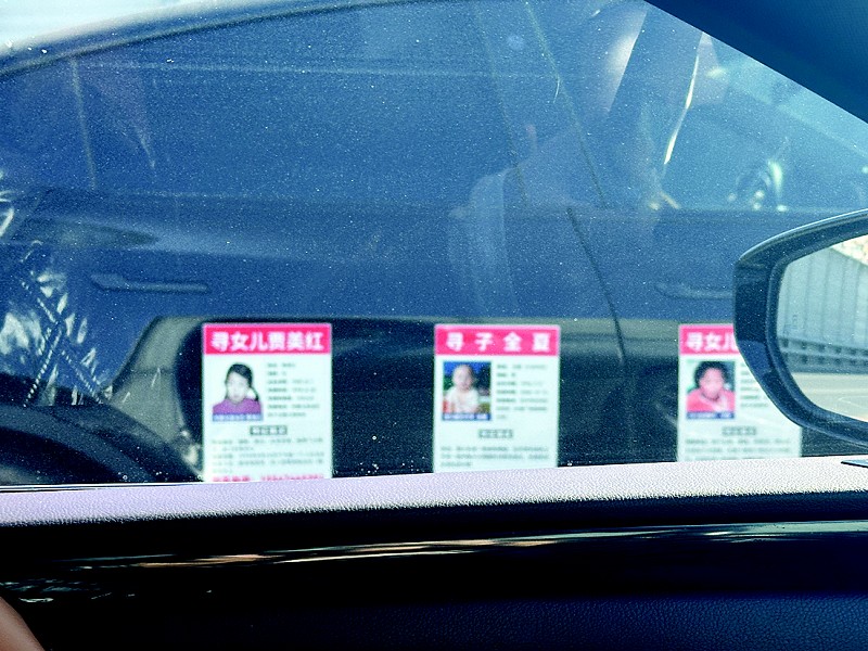 东联路车流中,一辆私家车车身贴满寻亲告示